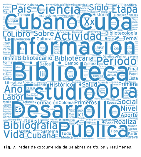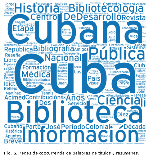 El espacio temporal donde se inscriben los fenómenos estudiados corresponden, en mayor medida, al período colonial y republicano. La presencia del término Habana, revela el predominio de la capital como espacio geográfico donde se ubican, con mayor frecuencia, los hechos objeto de investigación. Esto apunta a la escasa visibilidad de las investigaciones históricas del resto del territorio cubano en las fuentes consultadas. Desarrollo, actividad, creación, contribución, historia, cambios y evolución denotan la intención de sistematizar y generalizar los hechos que son reflejo de un pasado en constante transformación y estrechamente vinculado con aspectos de orden económico y cultural que forman parte de un contexto y de la sociedad. Muestran la incidencia del paradigma social en el tratamiento histórico de los fenómenos asociados al campo. Por otra parte, el análisis histórico de la literatura científica se combinó con la perspectiva bibliométrica y de análisis de contenido de manera que constituyó una subtemática representativa para la revelación de tradiciones profesionales.