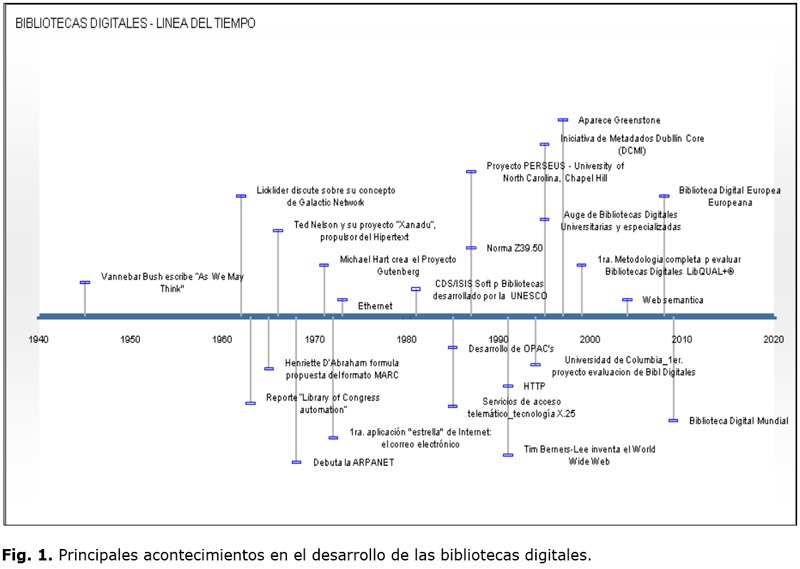 Un complejo conjunto de factores tecnológicos, sociales, y culturales, ha propiciado el surgimiento, desarrollo y consolidación de las bibliotecas digitales, que hemos resumido en la línea del tiempo propuesta en la figura 1. Cada elemento señalado ha revolucionado el campo de las investigaciones y la práctica sobre esta temática con una presencia cada vez mayor en diversos congresos, talleres y debates, tanto tradicionales como virtuales, cuyo resultado han sido una gran diversidad de proceedings, artículos, ponencias, reseñas, etc. reflejados en la literatura científica internacional e indexados en las bases de datos internacionales.