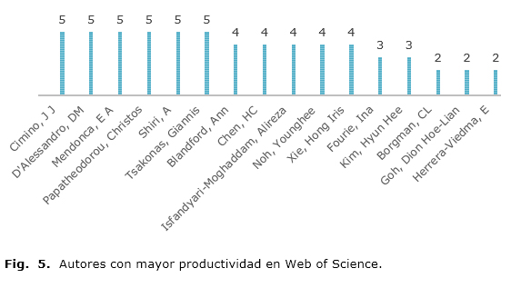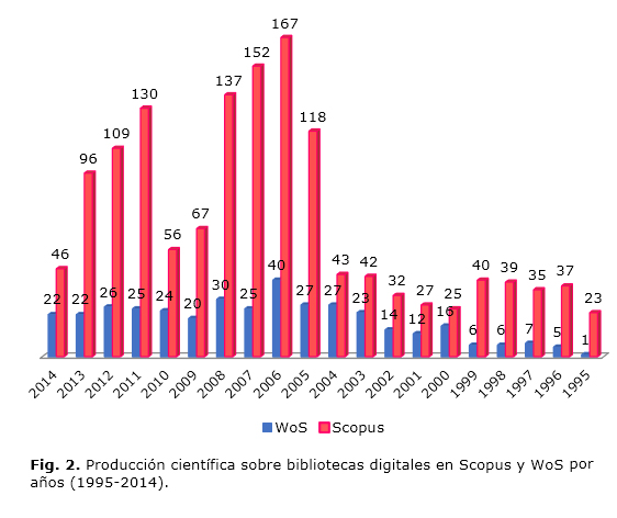 En la producción científica de los últimos 20 años (1995-2014) se observa un mayor cubrimiento sobre la temática de bibliotecas digitales en la base de datos Scopus, con 1 421 artículos sobre Web of Science (378 artículos). Los años más productivos en ambas bases de datos fueron 2005, 2006, 2007 y 2008 (Fig. 2).