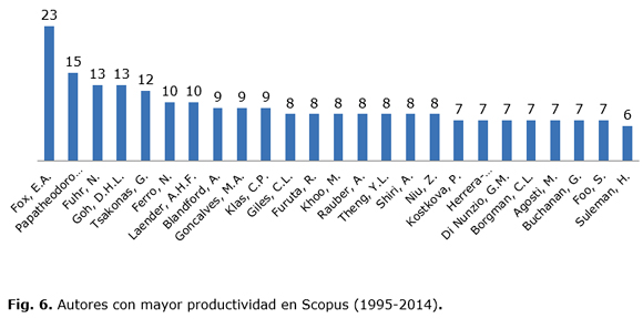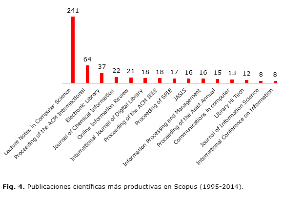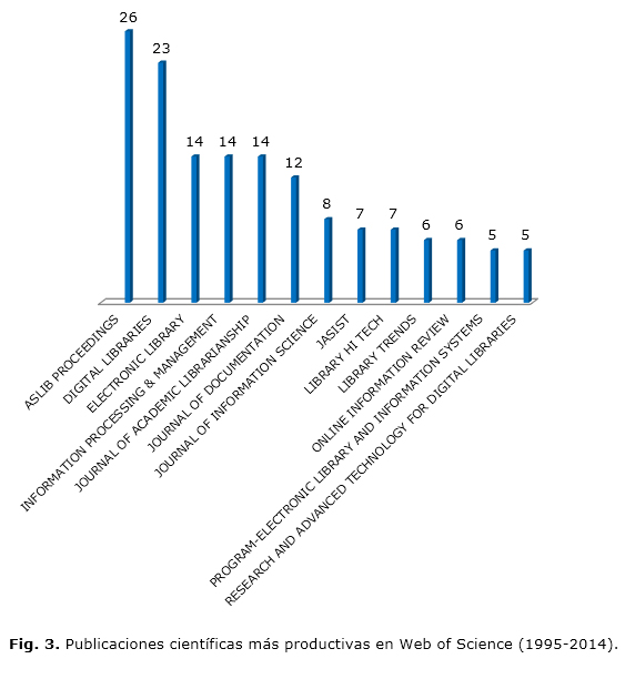 Publicaciones con mayor producción científica sobre bibliotecas digitales (1995-2014)