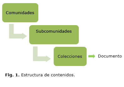 La organización de los documentos se prevé a partir de la creación de comunidades con base en la estructura institucional que contendrá subcomunidades que serán definidas por las escuelas, departamentos o en algunos casos por cursos para incluir objetos de aprendizaje y su interrelación con otras plataformas, como por ejemplo, Moodle. La estructura de los contenidos de RI-UNPHU propuesta, se aprecia en la figura 1: