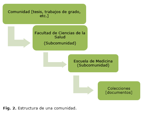 Las subcomunidades pueden corresponderse con dependencias administrativas, tales como facultades, escuelas, departamentos, o por tipos de documentos, grupos temáticos, etc., que sean relevantes y coherentes para la organización de contenidos y su recuperación. Dentro de cada comunidad puede haber un número ilimitado de subcomunidades, así como también de colecciones. Además, cada colección puede contener un número ilimitado de artículos. Un ejemplo de comunidad se evidencia en la figura 2: