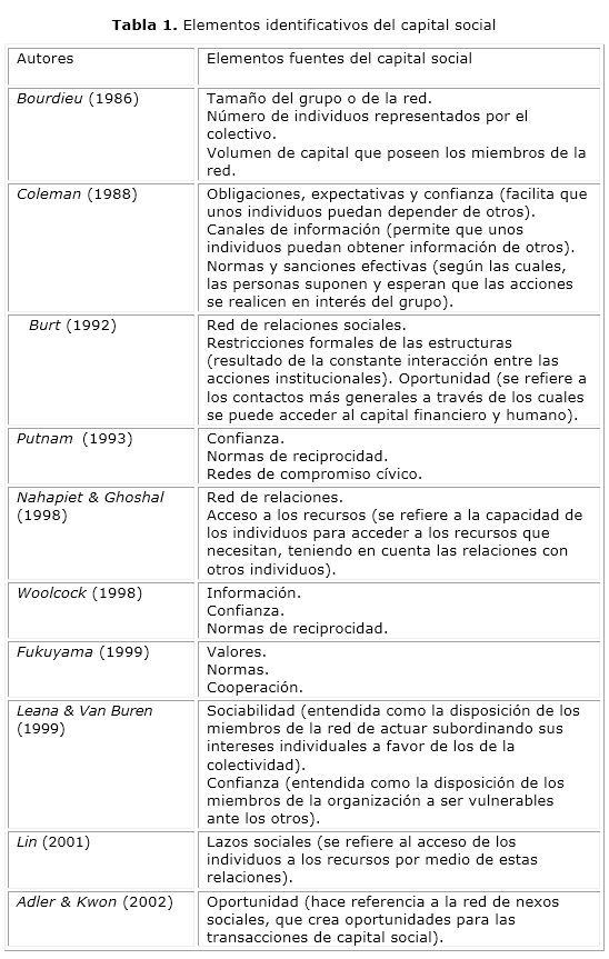 En las organizaciones se explica el valor que representa el capital social a través de las relaciones sociales que se establecen dentro de estas y con la comunidad; sin embargo, no solo se sustenta en estas relaciones y las redes sociales, sino también en los recursos con los que cuentan las estructuras y el acceso a estos. En esencia, se refiere a las redes de relaciones sociales, las normas de confianza y de reciprocidad, las capacidades, actitudes y valores de los individuos, el intercambio de recursos y la colaboración entre los distintos actores sociales que contribuyen al éxito de la organización, así como la capacidad de socialización y asociatividad, desarrollada por individuos y organizaciones. Los elementos significativos del capital social a partir de diversos criterios,6-12 sugieren aspectos que posibilitan la generación y el desarrollo de este capital dentro de una estructura social, como se presenta en la tabla 1.