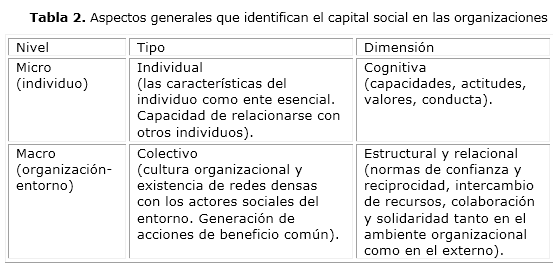 Teniendo en cuenta los criterios presentados, se considera que este capital explica el valor que representa para las organizaciones considerar las relaciones sociales que se establecen dentro de estas y con la comunidad. No solo se sustenta en las relaciones y redes sociales, sino también en los recursos con los que cuentan las estructuras sociales y el acceso a estos. De ahí que este capital se pueda identificar a partir de elementos particulares que se encuentran estrechamente relacionados y que, a su vez, revelan un carácter multidimensional. Además, es posible examinarlo desde diferentes enfoques y perspectivas, considerando su generación y desarrollo en diversos ambientes: individual, organizacional y externo. Se pueden resumir los diferentes niveles, tipos y dimensiones de capital social como elementos esenciales para su identificación en las organizaciones, de acuerdo con la tabla 2.