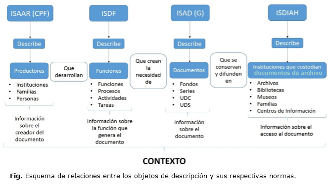 El presente artículo se propone exponer el proceso de descripción archivística para describir los fondos del Archivo Universitario de Ciencias Médicas de La Habana, y para esto utilizan como referencia cuatro normas propuestas por el Consejo Internacional de Archivos: la ISAD (G), Norma Internacional General de Descripción Archivística; la ISDF, Norma Internacional para la descripción de funciones; la ISAAR (CPF), Norma Internacional sobre los encabezamientos autorizados archivísticos relativos a entidades, personas y familias; y la ISDIAH, Norma Internacional para describir instituciones que custodian documentos de archivos. Estas normas están interrelacionadas y describen elementos relativos al contexto del documento; es decir, puntos de acceso a los documentos. La identificación y la relación de estos elementos permiten descripciones contextualizadas y multidimensionales. Las contextualizadas identifican al documento y su relación con entidades tales como el productor, la función y el archivo que las custodia; las multidimensionales, al establecer la conexión entre estas entidades, permiten reconocer los diferentes puntos de acceso al documento y sus características. Cada norma remite a un objeto de descripción, por lo cual si las normas están relacionadas, los objetos de descripción también; de hecho, son las relaciones existentes entre los objetos de descripción los que condicionan las relaciones existentes entre las normas.