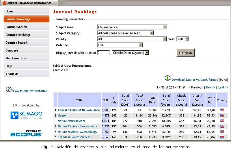 Probemos, por ejemplo, a seleccionar Neuroscience en el área temática (Subject area). Estas ventanas poseen menús desplegables. Y aceptemos los demás datos como nos los indica el sistema. Al oprimir el botón Refresh, SJR nos devuelve una relación de 255 revistas en el área, ordenadas en forma descendente según su SJR (puede seleccionarse cualquier otro indicador para organizar la lista) y que comprende para cada fuente (publicación) los siguientes datos además del referido SJR: título (title), índice H (H index), total de documentos publicados durante el 2008 (Total docs., 2008), total de documentos publicados entre 2005 y 2007 (Total docs., 3 years), total de referencias bibliográficas citadas en los artículos publicados en 2008 (Total refs.), total de citas recibidas en 2008 por los trabajos publicados entre 2005 y 2007 (Total cites, 3 years), el promedio de citas por documento en dos años (Cites/Doc., 2 years- factor de impacto tradicional), el número promedio de referencias por documento publicado en 2008 (Ref/Doc) y el país de la fuente (figura 2). Algunos de los indicadores expuestos requieren para su comprensión de una explicación más amplia. Comencemos por el SJR: