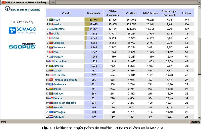La opción Country rankings (figura 3) ofrece la facilidad de clasificar los países según el número de documentos publicados entre 1996 y 2007 (Documents), documentos citables (Citable documents: artículos, revisiones y materiales de conferencias), total de citas recibidas por el conjunto de documentos publicados entre 1996 y 2007 (Citations), total de autocitas (Self-citations: se consideran las realizadas a revistas del país que se estudia), número promedio de citas recibidas por el total de documentos (Citation per documents) y el índice H (H index). Además de esta clasificación general, es posible obtener otras según áreas, categorías temáticas y regiones. Observemos, por ejemplo, esta de la Medicina en Latinoamérica (figura 4).