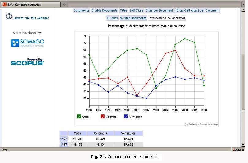 SCImago Journal & Country Rank is a portal and informetric and scientometric indicators allowing researchers, publishers, information specialists and policy makers in science, especially in underdeveloped countries, monitoring of performance and impact of their contributions all over world. He uses the extensive collection of literature available in Scopus. Third among other alternatives, to rank serials processed by Scopus, according to indicators such as SCImago Journal Rank (2008), total material published in the last three years (2005-2007), the number of citations received by these materials during the year under review (2008), the average citations per paper for the past two years (2006-2007), among others; to find the location of countries according to total papers published between 1996 and 2008, the number of citations received by them, the average use of their contributions or other; the analysis of a country according to variables such as productivity, number of citations, average citations per paper, the proportion of documents cited and not cited, the percentage of total production at the region where the country is located and so on; the comparison according to various indicators between countries or serials, as well as the generation of thematic maps. The platform that offers SCImago is an alternative very competent to services in these fields for years has provided the former Institute for Scientific Information of the United States, with poor access for developing countries because of its subscription scheme.