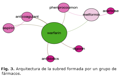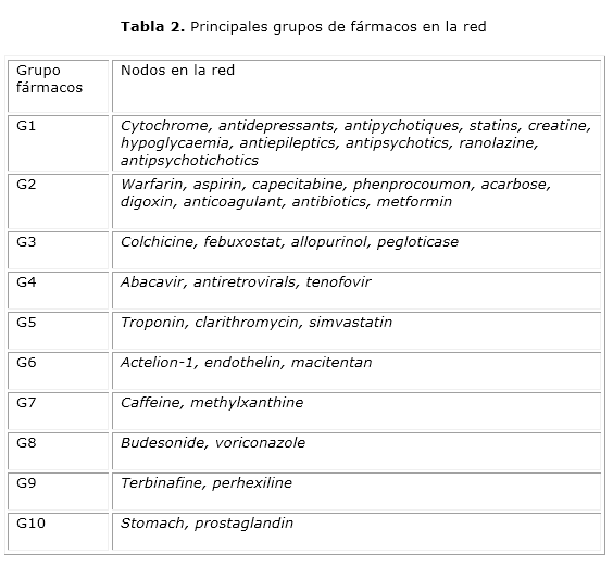 Dentro del agrupamiento G2 destaca de manera significativa el fármaco warfarin con un mayor valor de centralidad de grado con respecto a otros nodos que los componen. Hemos comprobado que las relaciones obtenidas con la métrica de centralidad de grado coinciden en su mayor parte con las que aparecen en la base de datos Medscape.7 Aún así, hay relaciones no-detectadas en dicha base de datos que podrían ser inferidas como warfarin+anticoagulant, warfarin+antibiotics, aspirin+anticoagulant, phenprocoumon+metformin. Esto significaría, según nuestro planteamiento, que el análisis de redes y la medida de centralidad de grado se podría utilizar para ratificar y descubrir posibles interacciones no-detectadas previamente.