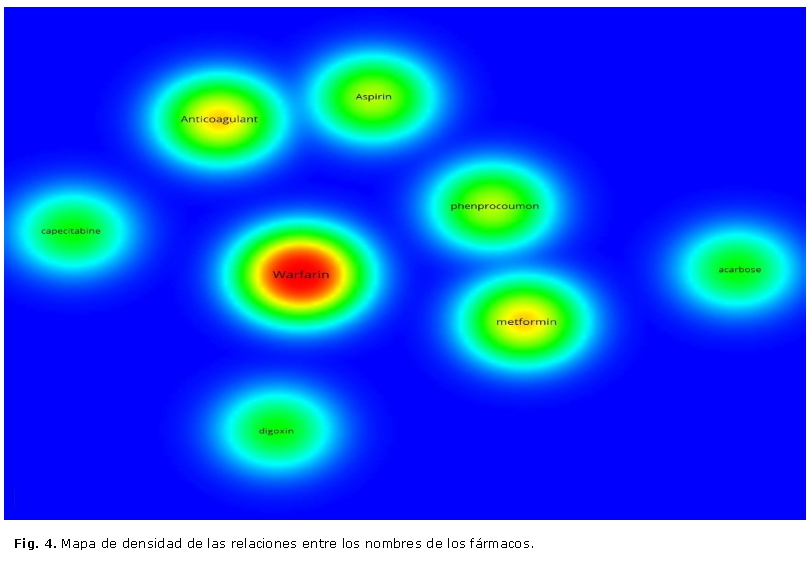 El mapa de densidad de este grupo de fármacos (fig. 4) refleja que el nombre de fármaco warfarin es el que mayor densidad de relaciones entre este grupo de fármacos; es decir, es el que mayor coocurrencia entre este grupo de fármacos seleccionado. A continuación, se procedió a analizar las propiedades estructurales en cada uno de los nodos de esta subred. Para comprobar los resultados obtenidos, consultamos previamente la base de datos de interacciones farmacológicas Medscape7 (tabla 4).