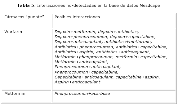 Utilizando esta métrica se ha cuantificado la frecuencia con la que un nodo actúa como "puente" entre dos nodos; es decir, mediría la frecuencia con la que un nodo aparece en el camino más corte entre nodos de la red de fármacos. En la subred que estamos analizando, los fármacos warfarin y metformin establecen conexiones entre los nodos separados y podrían ser utilizados para descubrir interacciones no detectadas en la base de datos Medscape.7 En la tabla 5 se muestran las posibles inferencias sobre interacciones que no se han detectado en la base de datos que estamos tomando como referencia. Según nuestro planteamiento, la Centralidad de Intermediación se trataría de la métrica más eficaz para descubrir interacciones en la literatura biomédica. Por lo tanto, la aplicación de esta medida nos permitirá predecir posibles interacciones desconocidas. En todo caso, las interacciones descubiertas requerirán un posterior análisis experimental para comprobar su relevancia clínica.