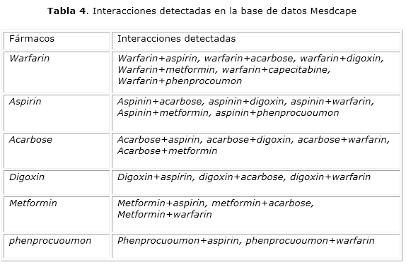 Por último, dada la dificultad y la especificidad del tipo de relaciones que estamos analizando, para comprobar las interacciones detectadas y el descubrimiento de posibles interacciones hemos usado la base de datos de interacciones farmacológicas Medscape.7
