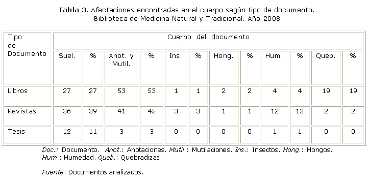 En las afectaciones encontradas en el cuerpo del documento, los libros analizados presentaron 27 (27 %) hojas sueltas, 53 (53 %) anotaciones y mutilaciones, 1 (1 %) estaba afectada por insectos, 2 (2 %) por hongos y 19 (19 %) hojas se encontraban quebradizas. Las revistas mostraron 36 (39 %) hojas sueltas, 41 (45 %) con anotaciones y mutilaciones, 3 (3 %) afectadas por insectos, 1 (1 %) por hongos, 12 (13 %) hojas húmedas, 2 (2 %) quebradizas. En relación con las tesis, se hallaron 12 (11 %) hojas sueltas, 3 (3 %) anotaciones y mutilaciones, 1 (1 %) hoja húmeda, ninguna fue afectada por insectos y hongos ni presentan hojas quebradizas (tabla 3).