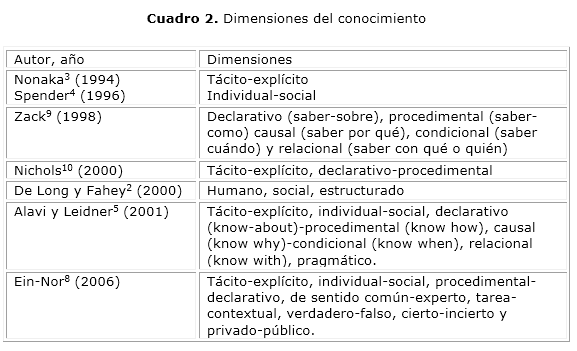 Las taxonomías relativas al conocimiento pueden ordenarse de acuerdo con su grado de generalidad. Puede verse el conocimiento a su más alto nivel de abstracción, señala Sowa,7 mientras que también se presentan asociadas a campos específicos, indica Ein-Nor.8 En general, la más común es donde se mencionan sus dimensiones, presentes en el cuadro 2, a partir de determinados autores.