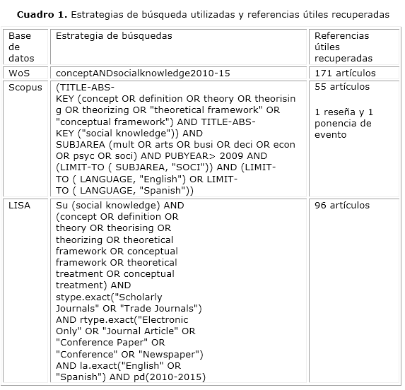 Se realizó una investigación exploratoria mediante el análisis documental clásico y el análisis de contenido. Se estudiaron documentos -mayoritariamente artículos especializados- resultantes de búsquedas efectuadas en las bases de datos Scopus, Thomson, Reuters, Web of Science (WoS) y Library and Information Science Abstracts (LISA). Las principales estrategias ejecutadas en cada caso aparecen en el cuadro 1. Se consultaron además documentos relevantes sobre conocimiento social y su gestión en Google Académico, los cuales no fueron contabilizados.
