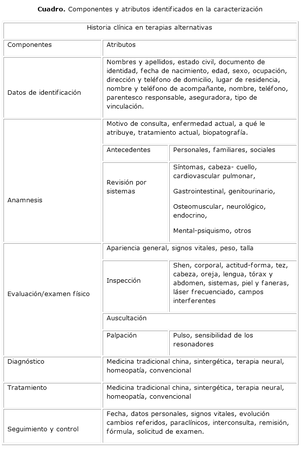 En la visita realizada a las instituciones, se pudo apreciar que no existía un instrumento estandarizado para el registro de historias clínicas en TA. Cada institución maneja su propia herramienta para el registro de datos. Sin embargo, surgieron los siguientes componentes en común de la historia clínica para terapias alternativas: datos de identificación, anamnesis, evaluación, diagnóstico, tratamiento y seguimiento y control. A su vez, estos componentes comprenden atributos generales y atributos específicos.