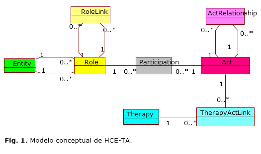 El modelo muestra los conceptos con sus respectivas relaciones, y define así la estructura de información y el conocimiento relacionado con HCE-TA. Entity, Role, Participation, Act, RoleLink y ActRelationship son especificadas por la Clinical Document Architecture (CDA)***, de HL7 v3.10,11 Se agregaron los conceptos Therapy y TherapyActLink, que no son incluidos en el estándar HL7.
