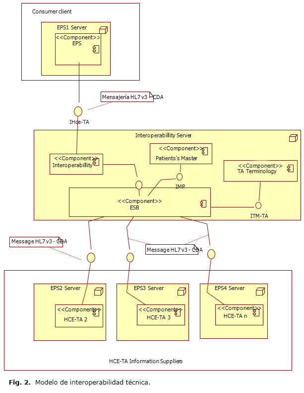 El modelo de interoperabilidad de HCE-TA presenta tres componentes globales: