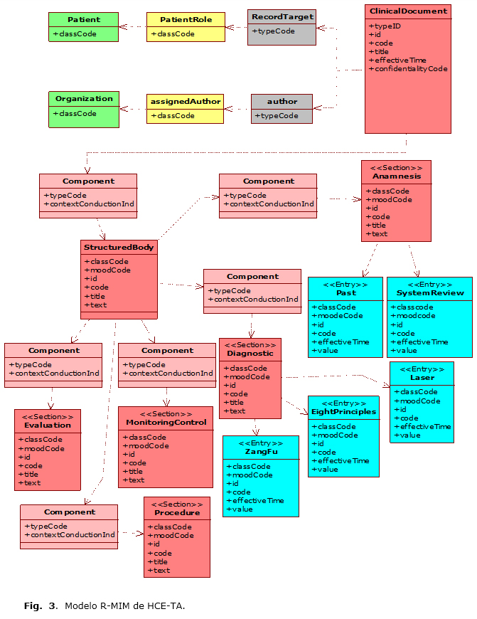 - Para el modelo de información se hizo un análisis del modelo de referencia Refined-Message Information Model (R-MIM)*****, de HL7 para CDA y de sus clases, que estudia la cardinalidad de las relaciones entre ellas. Este análisis se aplica en el contexto del proyecto de acuerdo con la caracterización realizada para HCE-TA. En la figura 3 se observa el diseño del modelo de información del R-MIM del CDA restringido para el documento clínico en terapias alternativas. Se debe tener en cuenta que los colores corresponden a los presentados en la figura 1, de forma tal que el color verde corresponde a la especialización de una entity, el amarillo a un rol, el gris a una participation, el rojo a un Act y el color cian a una therapy.