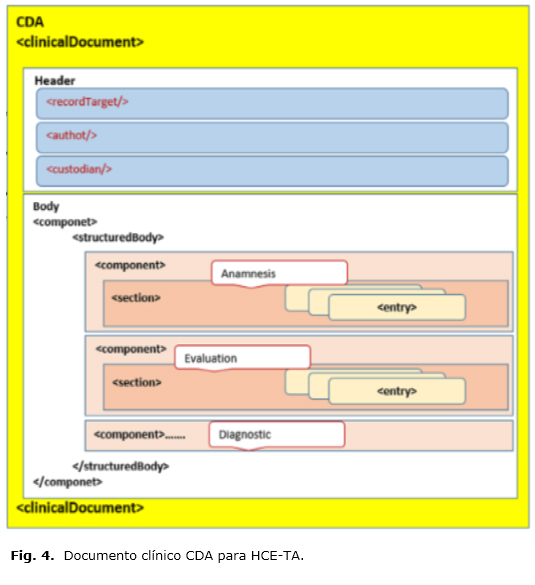 - En la figura 4 se observa el diseño del mensaje; en la estructura básica de un documento clínico bien formado, deben distinguirse un header que contiene los metadatos del documento, y un body que contiene los datos concernientes a los enunciados de los actos clínicos como evaluación, diagnóstico, tratamiento y control, que son parte del documento. Los colores utilizados en la figura, se usaron solo con el objetivo de mostrar la estructura del documento, sus componentes internos y las relaciones de dependencia entre sí.
