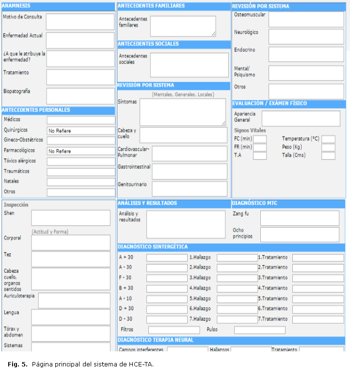 A continuación se describen las interfaces gráficas de usuario más relevantes en el sistema de gestión de información. En la figura 5 se observa la página principal de la interfaz gráfica del sistema HCE-TA, la cual presenta secciones para la anamnesis, antecedentes personales, familiares y sociales, revisión por sistema, análisis y resultados, diagnóstico de medicina tradicional china, sintergética, terapia neural y homeopatía.