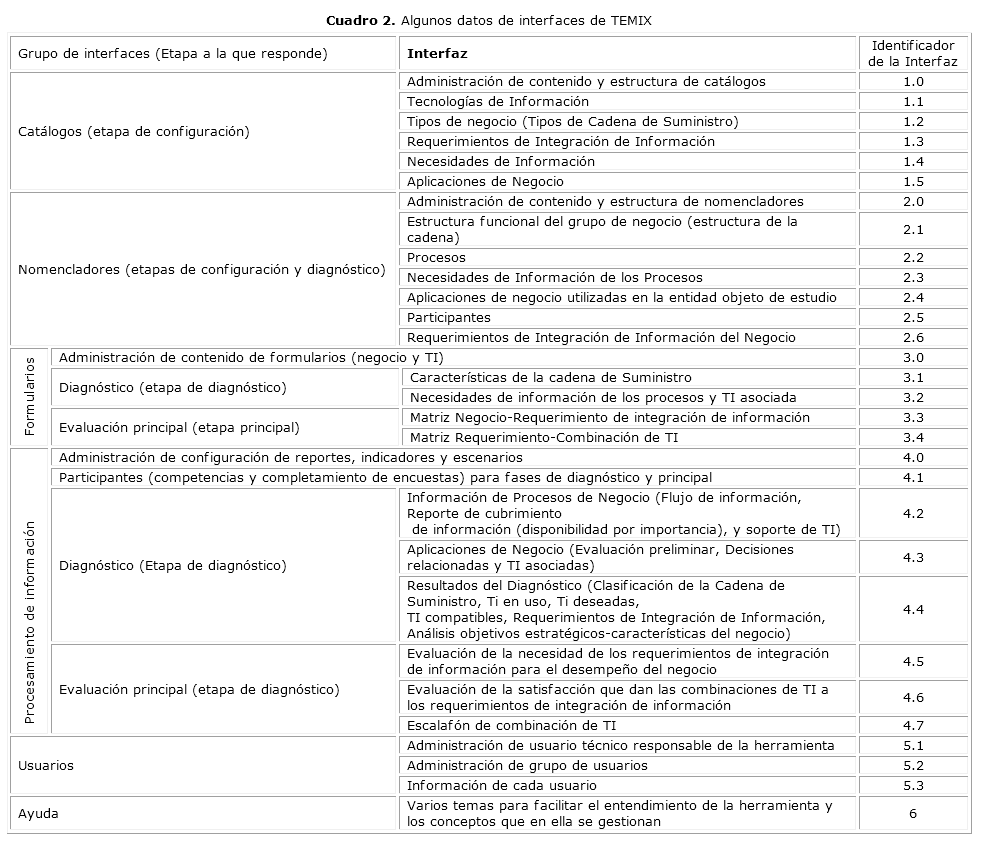 Entre los enfoques para la evaluación de las tecnologías de información se destaca el marco propuesto por Themistocleous, Irani y Love.7 sin embargo, hay dos brechas fundamentales:18 una en el establecimiento formal de procedimientos de decisión que puedan convertirse en formas de acción repetibles y controlables en entidades, y la otra en el análisis superficial de las necesidades de negocio o en la preponderancia del análisis de necesidades de TI dada una pobre definición de las necesidades del negocio. Esto conlleva el desarrollo de TEMIX analizado en el cuadro 2 y la figura 1.