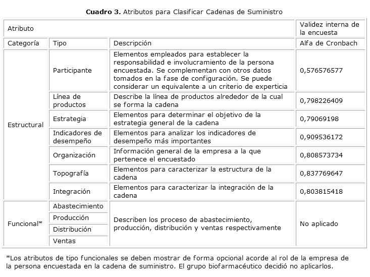Una vez seleccionados los atributos para caracterizar al negocio, durante las pruebas piloto se siguieron las recomendaciones de Gillyard28 respecto al diseño y validación de encuestas relacionadas con la tipificación de cadenas de suministro y se mide la validez de los constructos empleados para la caracterización mediante el cálculo del Alfa de Cronbach, asumiendo que los resultados con valores mayores a 0,70 son aceptables para realizar la medición. El cuadro 3 muestra que 6 de los 7 factores analizados tienen una confiabilidad satisfactoria.
