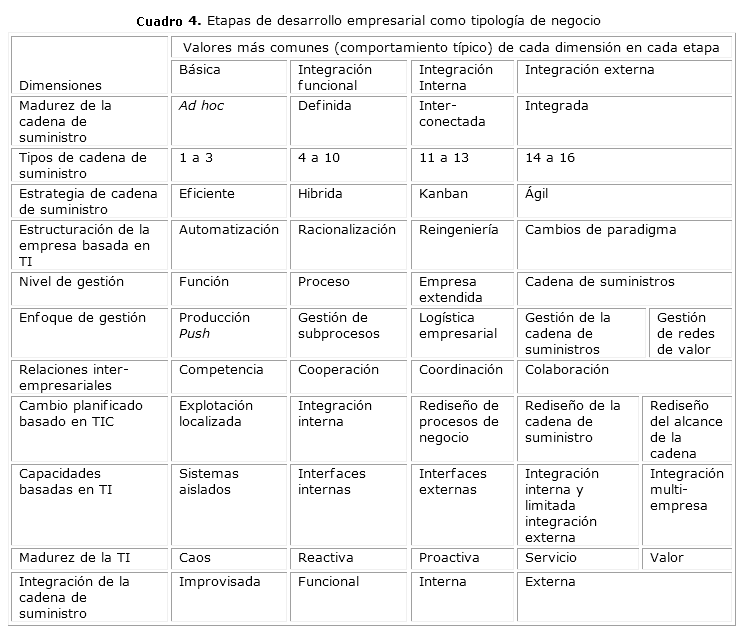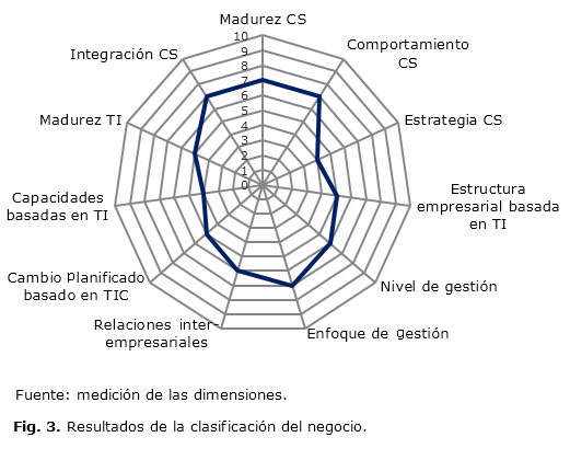 La caracterización del negocio muestra una estrategia de cadena de suministro híbrida, con mayor tendencia a la priorizar la eficiencia, y punto de desacoplamiento de producción a distribución. La madurez de la cadena de suministro es definida y presenta ya características de una cadena inter-conectada, con comportamiento de monopolio del mercado nacional (comportamiento 11). Este resultado fue extendido para evaluar las otras 8 dimensiones presentadas en el cuadro 4, y se obtuvieron los resultados mostrados en la figura 3, que permiten analizar cómo los requerimientos de integración de información reflejan el estado de desarrollo del negocio. La entidad está en la frontera entre racionalización y reingeniería (centrada en lograr respuestas inter-departamentales coordinadas, aplicando un enfoque a procesos, e incrementando el uso de las TI en sus formas de gestión), un nivel de gestión de empresa extendida con algunos rasgos de cadena de suministros que es consistente con su enfoque de gestión, donde se aprecian, además, relaciones inter-empresariales de coordinación y la transición de la integración interna al rediseño de procesos de negocio; sin embargo, las capacidades basadas en TI están a nivel de interfaces internas con una integración funcional de la cadena de suministros. Dadas estas características, en la transición a los niveles superiores de desarrollo, el grupo debe potenciar la integración de información de inventarios y pronósticos colaborativos.