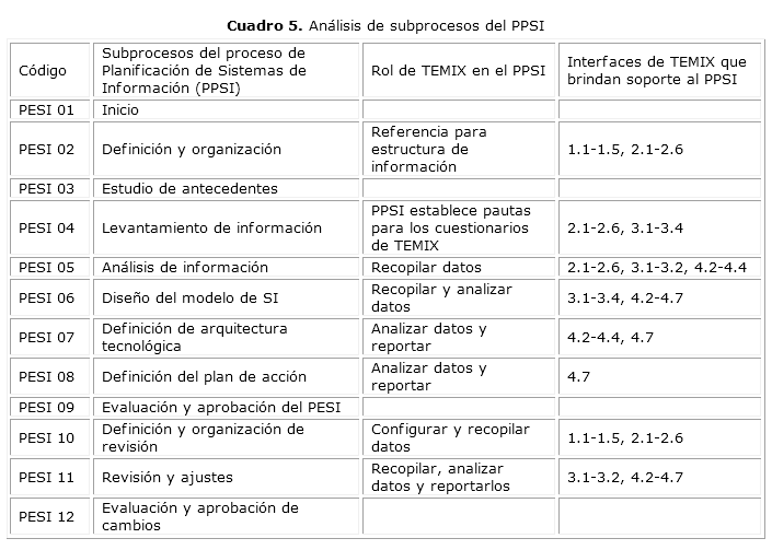 Es precisamente la etapa de diagnóstico de TEMIX la génesis de la integración con el Proceso de Planificación de Sistemas de Información diseñado por Hernández Lantigua.17 En la primera versión del plan del grupo biofarmacéutico, la tecnología de información empleada como soporte, además de software de ofimática, fue TEMIX. Se utilizaron interfaces de TEMIX como complemento a: estudio de información relevante, identificación de requerimientos, estudio de SI en uso, diseño del modelo de SI, análisis de infraestructura de TI, plan de proyectos y plan de mantenimiento, donde fue diseñada la interfaz 4.4, específicamente para mostrar los resultados del diagnóstico a la empresa, como ilustra el cambio en los resultados de la etapa de diagnóstico en la figura 2. Sin embargo, en el grupo biofarmacéutico quedaba el reto de superar el carácter estático del PESI. Por esta razón la investigación de Hernández Lantigua17 continúa el trabajo de León Alen14 para elaborar una propuesta de PPSI que aportara carácter de mejoramiento continuo a la planificación de SI. En la actual propuesta de PPSI, TEMIX ha sido concebido desde el diseño como un elemento de la planificación, lo que se muestra en el cuadro 5.