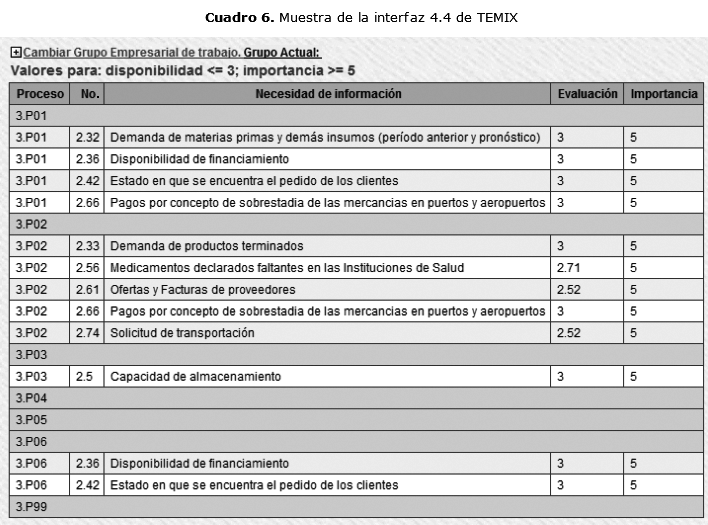 Asociado a las necesidades de mejora, se diseña la interfaz 4.4 de TEMIX, mostrada en el cuadro 6 como un reporte, y se muestran las informaciones dado el nivel de disponibilidad y la importancia seleccionada; por ejemplo, las informaciones que tienen mayor importancia y están disponibles la mitad o menos de las veces que se necesita consultarlas. El esclarecimiento de las interrelaciones de información acorde con las necesidades para la toma de decisiones estratégicas lograda con el PESI llevó a la identificación particular de decisiones subjetivas que presentaban un lastre para el desempeño del grupo; por ejemplo, se ajusta el tamaño del lote de exportación acorde con los datos más precisos de demanda, lo que mejora el aprovechamiento de los recursos dedicados a la distribución en un 10 %, y elimina excesos de inventario y riesgos de caducidad de los medicamentos.14