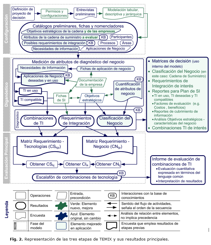 Como se muestra en la figura 1, TEMIX se basa en determinar requerimientos de integración y combinaciones de TI relevantes para ser evaluadas, de conjunto con la elaboración de un prototipo que se ajustaba a las especificaciones de las empresas de la industria farmacéutica que colaboraron con el desarrollo del modelo como parte del desarrollo de su PESI.