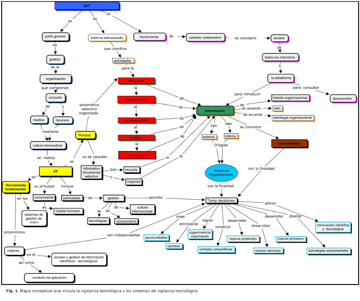 Este autor recomienda que estos componentes deben fusionarse para formar parte de la vigilancia estratégica de la organización y servir a la toma de decisiones. Un SVT debe tener presente las necesidades de los ejecutivos, los objetivos estratégicos de la organización, la definición de cada fase del proceso y de la correspondiente selección de las fuentes de información. Es indispensable definir el tipo de herramienta informática que mejor se adecua para cada situación. Se debe adaptar al entorno de la empresa y a su cultura, y debe estar integrado en sus procedimientos habituales.13-15 Los aspectos antes mencionados condicionan que el SVT incluya:5