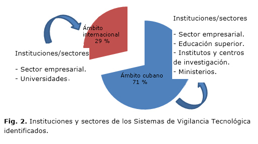 Para caracterizar los SVT y determinar sus elementos distintivos, se identificaron un total de 21 SVT (15 sistemas en el ámbito cubano y 6 en el internacional). En la figura 2 se muestran los principales sectores e instituciones a los que pertenecen los sistemas objeto de análisis.