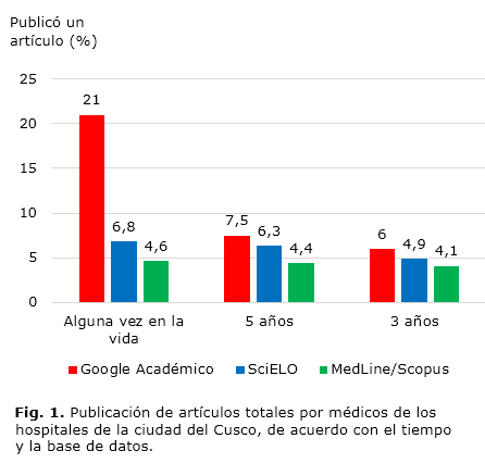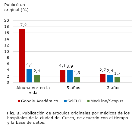 Para la publicación de artículos originales, el 17,2 % de los médicos había publicado por lo menos una vez en su vida en Google Académico y el 4,4 % en SciELO. De acuerdo con la búsqueda en Medline y Scopus, el 1,7 % había publicado un artículo original en los últimos 3 años (Fig. 2).