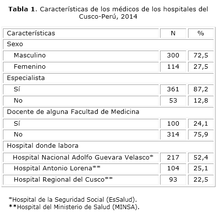 Se incluyeron en el estudio los datos de 414 médicos de los tres hospitales de la ciudad del Cusco. El 72,5 % (300) fueron varones, el 87,2 % (361) especialistas y el 24,1 % (100) docentes de alguna Facultad de Medicina Humana del Cusco. Las características de los sujetos del estudio se describen en la tabla 1.