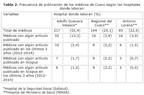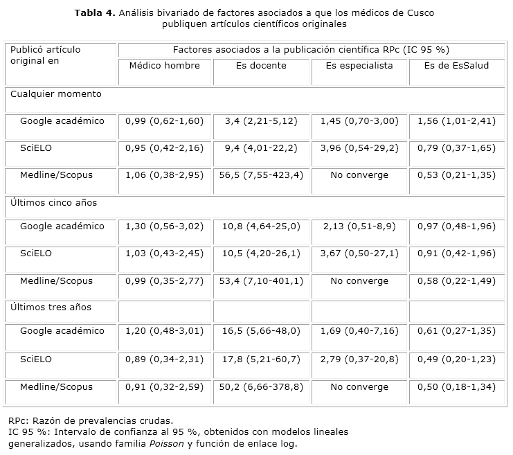 Se concluye que muy pocos de los médicos de Cusco habían publicado un artículo original en una revista científica al menos una vez en su vida o en los períodos evaluados; las publicaciones fueron en su mayoría en bases latinoamericanas; el Hospital de la Seguridad Social fue el que tuvo más médicos publicadores; el tipo de artículo más frecuente fue el artículo original, y el ser docente de una Facultad de Medicina se asoció a una mayor frecuencia de publicación en los tres períodos y en las bases evaluadas.