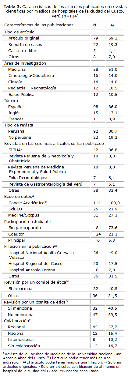 Se encontraron 114 publicaciones. El tipo de artículo más publicado fue el artículo original (69,3 %), del cual solo el 40,5 % mencionó haber tenido revisión por un comité de ética; Medicina fue el área más investigada (50,9 %). El 86,0 % de los artículos fue publicado en español y el 80,7 % fue publicado en revistas peruanas. Las bases de datos donde se ubicaron una limitada cantidad de artículos fueron Medline y Scopus (27,2 %) cada uno. En cuanto a la filiación al momento de la publicación, el 49,1 % de los artículos tenían como filiación al Hospital Nacional Adolfo Guevara Velasco (HNAGV), mientras que el 31,6 % no tenían afiliación de alguno de los hospitales de la ciudad del Cusco. En 30 (26,4 %) artículos participaron estudiantes de Medicina, quienes eran autores principales en 6 (5,3 %) de ellas. En el 57,7 % de los artículos publicados hubo colaboración regional al momento de la publicación (tabla 3).