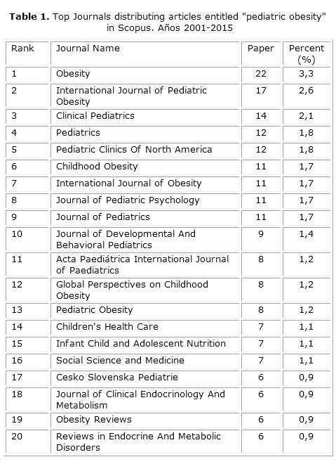 As shows the table 1, from a total number of 160 journals contributing papers entitled pediatric obesity, indexed in Scopus, the Journal of Obesity sharing 3.3 % (22 papers) of the global publication entitled "pediatric obesity" was the most productive journal, followed by the international Journal of pediatric obesity (17 papers), Journal of Clinical Pediatrics (14 papers), and Journal of Pediatrics (14 papers). Table 1 is restricted to the 20 top productive journals, those published papers entitled pediatric obesity during years 2011-2015.