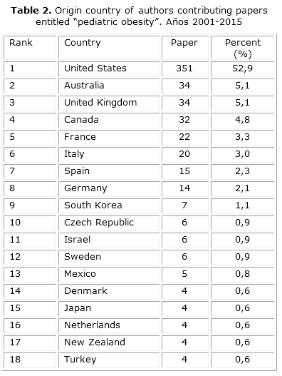 Authors from 39 countries shared their papers entitled pediatric obesity in Scopus during years 2011-2015. The American authors were the most productive authors, sharing 52.9 % of global publication entitled "pediatric obesity", followed by authors from Australia sharing 34 papers, United Kingdom sharing 34 papers, Canada sharing 32 papers, and France sharing 22 papers in the field in the database of Scopus during the period of study. Regarding to the origin regions of published papers, they mostly came from North America and Western Europe. Table 2 shows the origin country of authors, who shared their works in Scopus.