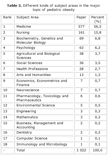 The content analysis of obtained papers identified that the scientists' methodologies towards pediatric obesity were in eighteen different subject areas. The subject area of medicine was the most frequented of them followed by nursing subject area, the subject area of "Immunology and Microbiology" was the least one. Regarding the important influence of socio-psycho-genetic aspects on the pediatric obesity, these issues are crucial issues related to the obesity; hence it is strongly recommended the nutritional scientists and policy makers in research centres to take under consideration these issues of study.