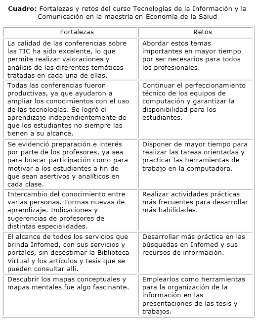 Al emplear la revisión bibliográfica y el análisis documental se decidió retomar los temas de TIC ya previstos en las ediciones anteriores del curso. Se incorporó la actualización necesaria y se añadieron otros contenidos de interés por su novedad y aplicación en las investigaciones sobre economía de la salud. Se indagó en el uso de estas herramientas de trabajo colaborativo y sus posibilidades de generar debate entre los estudiantes hasta el momento incorporados al curso (27), así como potenciar un trabajo de construcción colectiva de conocimiento entre estos. De este modo se previó, a partir de la estrategia metodológica implementada, enfocar la ética y los valores asociados al uso de las tecnologías y la gestión de la información.
